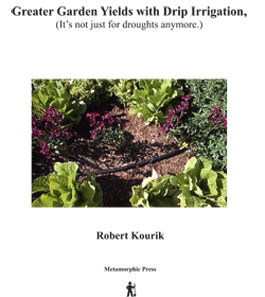Once again, Robert Kourik has done it! His latest book, Greater Garden Yields With Drip Irrigation, is the perfect blend of down to earth practical advice and interesting scientifically accurate information. Many current horticultural writers simply rehash old material, write from dry scientific perspectives, or are high on blissful visions but low on grit beneath the fingernails. Whereas, Robert has a very firm grip on the latest horticultural science combined with years of practical experience as a highly respected professional environmental landscaper. He knows how to turn visions of a personal Eden into reality.